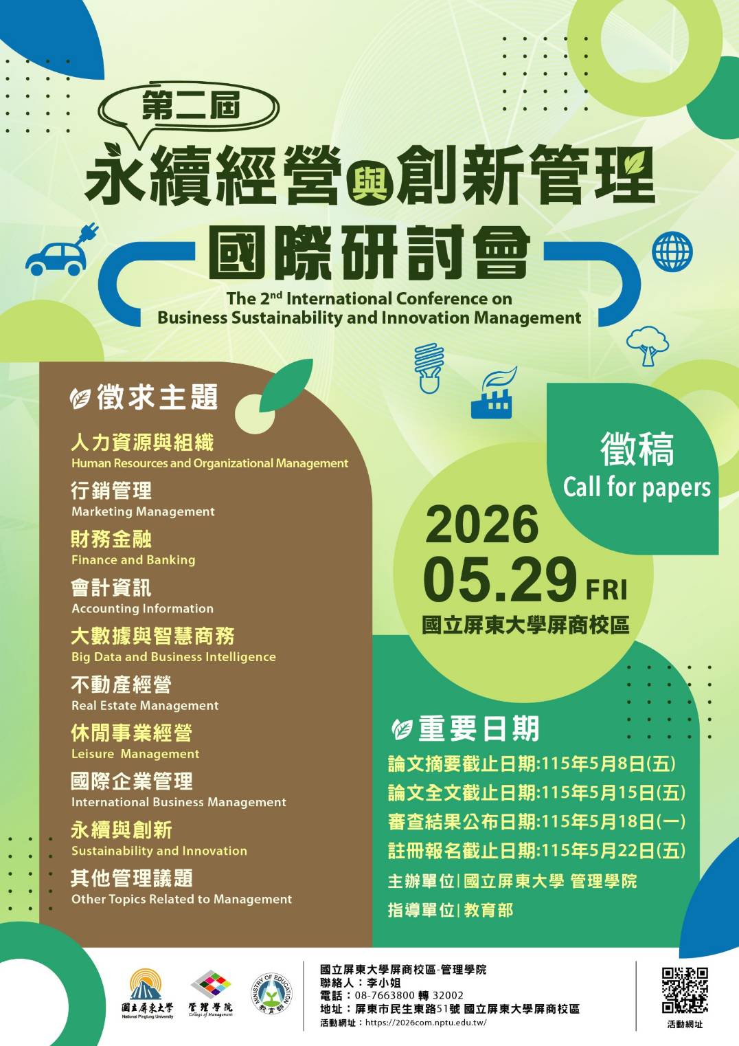 ⭐2026年05月29日(五) 【永續經營與創新管理國際研討會】請踴躍投稿及報名參加⭐